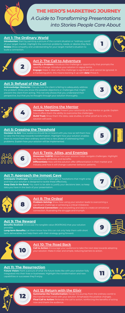 Not every element from The Hero’s Marketing Journey needs to be put on the screen—a lot of it should come from the way to present the information verbally. When you practice presenting the information, you might realize the story makes more sense if you move different elements around into different spots and you’ll build a more cohesive presentation.